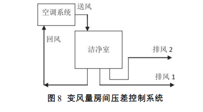對(duì)于部分潔凈車間,由于其生產(chǎn)活動(dòng)的變化,房間對(duì)外壓差可能有正負(fù)壓切換的需求,如正負(fù)壓切換手術(shù)室。對(duì)于需要正負(fù)壓切換控制的潔凈車間,通常通過(guò)調(diào)整潔凈車間的排風(fēng)量來(lái)實(shí)現(xiàn)正負(fù)壓切換。房間維持正壓時(shí),排風(fēng)量較小,房間維持負(fù)壓時(shí),排風(fēng)量較大。具體的風(fēng)量通過(guò)計(jì)算確定。變風(fēng)量壓差控制系統(tǒng)見(jiàn)圖 8。通常根據(jù)計(jì)算結(jié)果選用兩臺(tái)排風(fēng)機(jī),正壓運(yùn)行時(shí)只開(kāi)啟一臺(tái)排風(fēng)機(jī),負(fù)壓運(yùn)行時(shí)同時(shí)開(kāi)啟兩臺(tái)排風(fēng)機(jī)。
