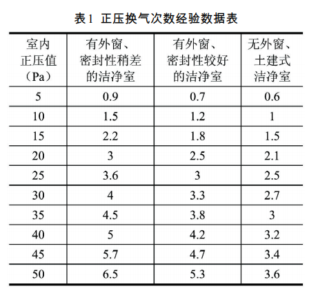 相對(duì)正壓潔凈車間的滲透風(fēng)量,通常也成為正壓風(fēng)量,是維持室內(nèi)正壓所需的風(fēng)量,即公式 1中的 LA。對(duì)于相對(duì)負(fù)壓的潔凈車間,其滲透風(fēng)量值為負(fù),即空氣自周圍房間滲透進(jìn)入負(fù)壓潔凈車間。滲透風(fēng)量的設(shè)計(jì)計(jì)算通常有兩種,其一是換氣次數(shù)法,其二是縫隙法。換氣次數(shù)法,就是根據(jù)潔凈車間相對(duì)正壓的值確定正壓換氣次數(shù),依次計(jì)算正壓滲透風(fēng)量。對(duì)于房間正壓與換氣次數(shù)之間的關(guān)系,相關(guān)設(shè)計(jì)手冊(cè) / 規(guī)范給出了推薦數(shù)值(見(jiàn)表 1)。