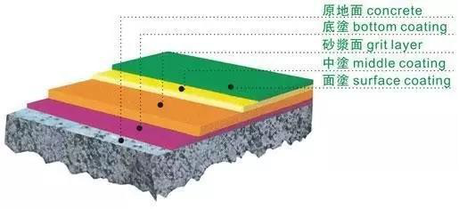 五、面 涂 層:待中涂層完全固化后,用磨機(jī)磨去突起的顆粒等雜物,然后清掃、除塵,再將無色透明的環(huán)氧面涂料調(diào)配均勻后用鏝刀平鏝在中涂層上。
